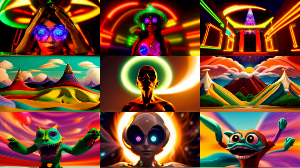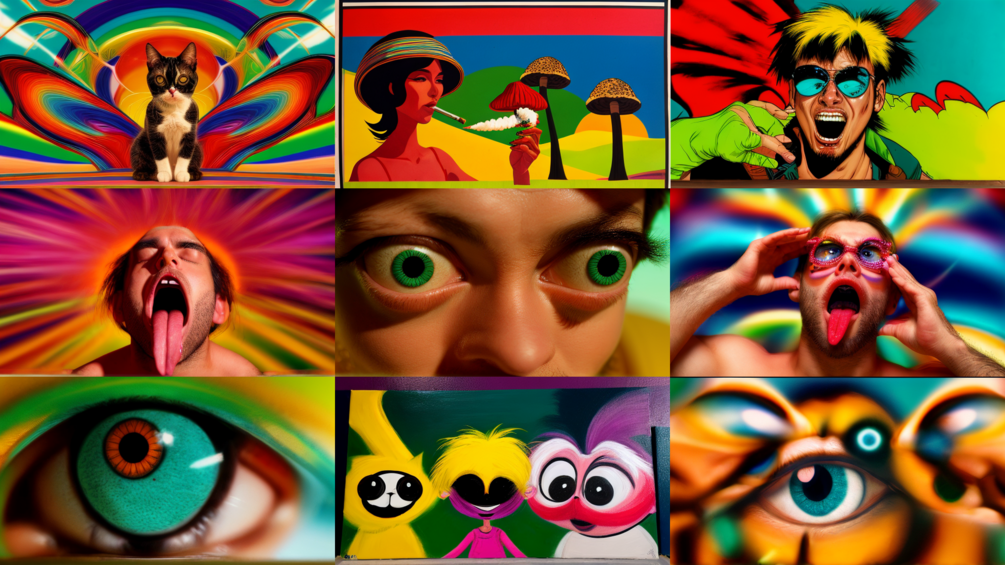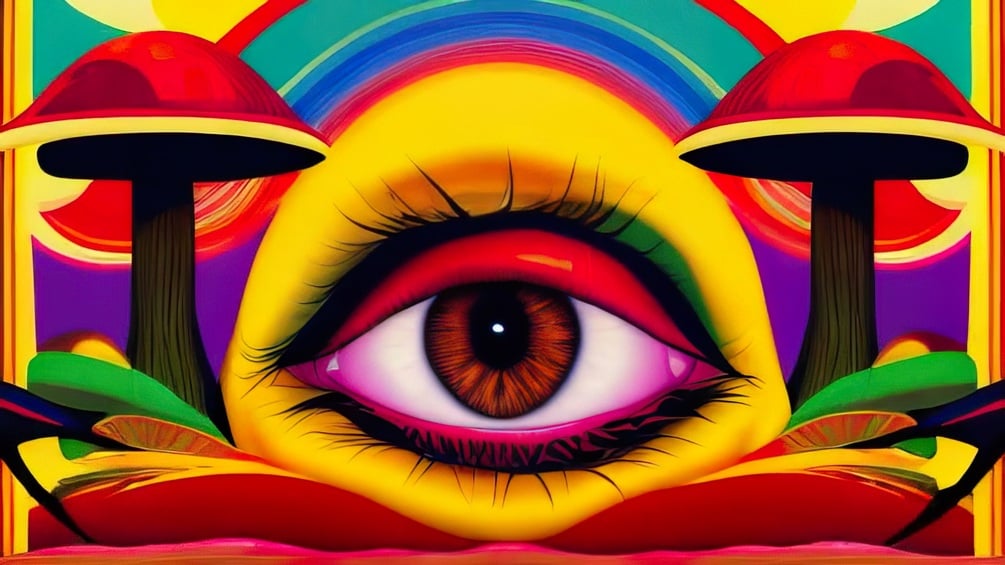 keywords: psychedelic, trippy, mushrooms, all seeing eye, colorful, aliens, animals, fusion, nature, space, eyecandy